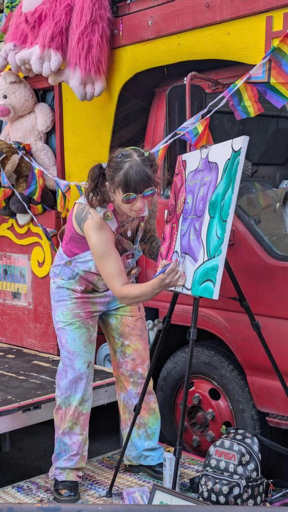 Candace ‘CeeCee’ Collins is a San Francisco-based artist whose bold, provocative work champions sexual liberation and the decriminalization of sex work. She discovered her passion for painting in 2020 during the pandemic, using art as a means of self-expression and activism. Known for her vibrant color palettes and unapologetic themes, CeeCee’s work challenges societal norms while celebrating desire, empowerment, and bodily autonomy. Through exhibitions, collaborations, and public art projects, she continues to spark dialogue, spread joy, and advocate for a world where all forms of consensual work and pleasure are respected.